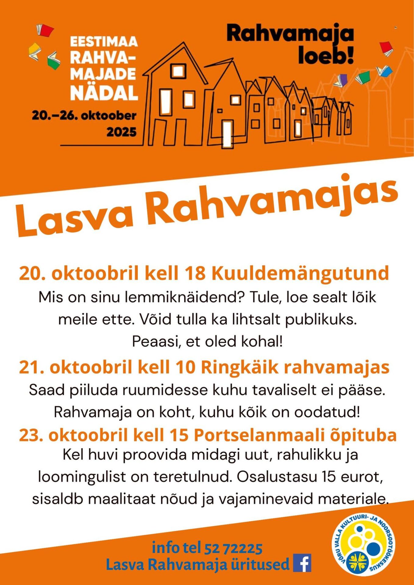 Rahvamajade nädal on hea võimalus astuda sisse oma kodurahvamajja. Sündmuste täpsem info kodukandi rahvamaja või valla kodulehel. Kaasa elama, kuulama, lugema ja looma on oodatud kõik huvilised.