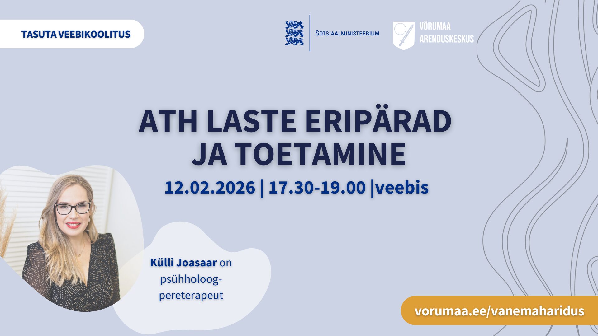 12. veebruaril kell 17.30-19.00 toimub veebiülekandena koolitus “ATH laste eripärad ja toetamine” lapsevanematele, vanavanematele ja laste ning noortega tegelevatele spetsialistidele.