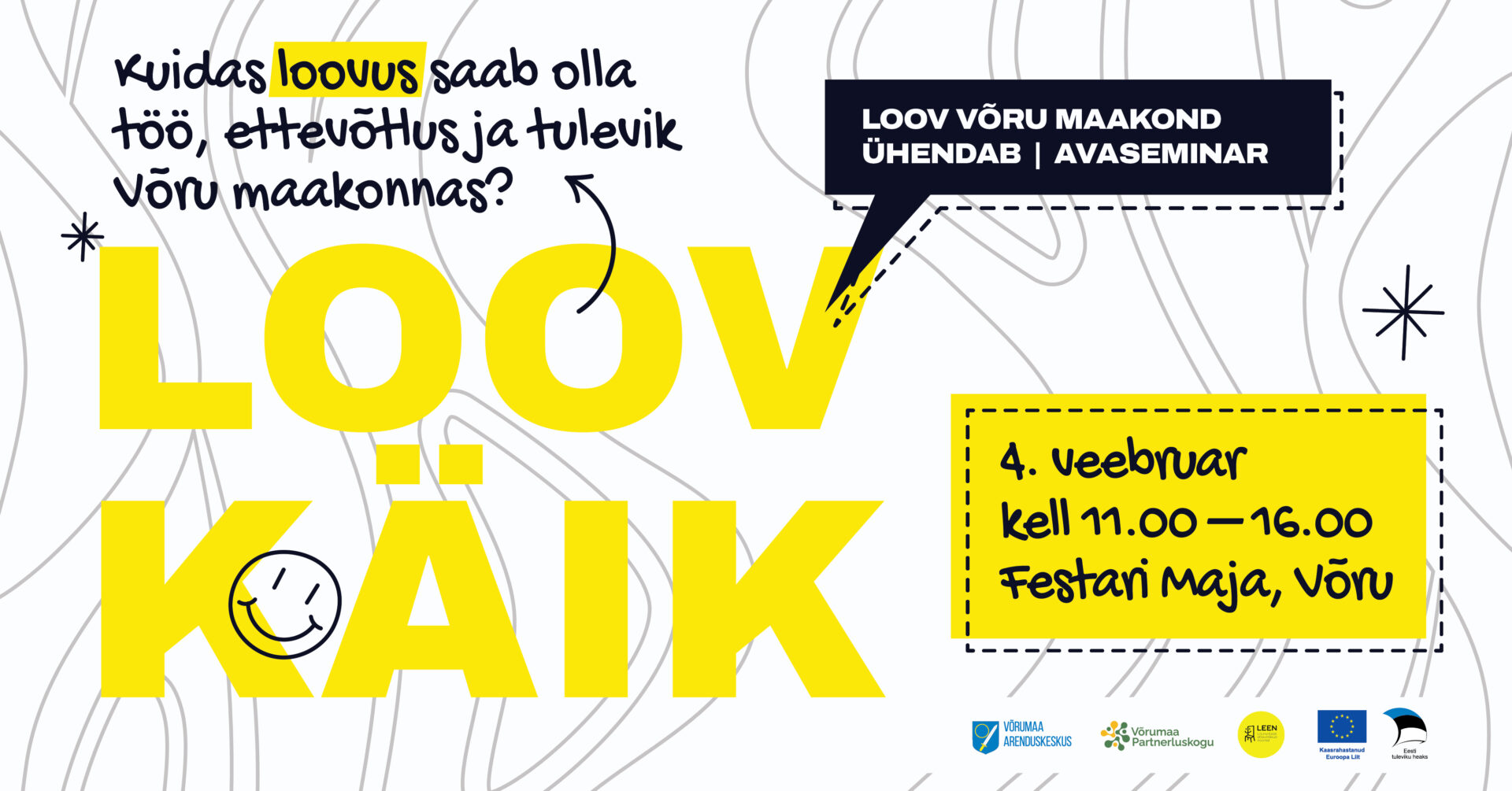 Võrumaa Arenduskeskus kutsub loome- ja kultuurivaldkonna tegijaid, loomeettevõtjaid, kohalike omavalitsuste ja kogukondade esindajaid, eestvedajaid, Võru maakonna noori ning kõiki, keda huvitab loov Võru maakonna tulevik, osalema projekti „LoovKäik – Loov Võru maakond ühendab“ avaseminaril. Seminaril arutatakse, kuidas loovus saab olla töö, ettevõtlus ja tulevik Võru maakonnas.