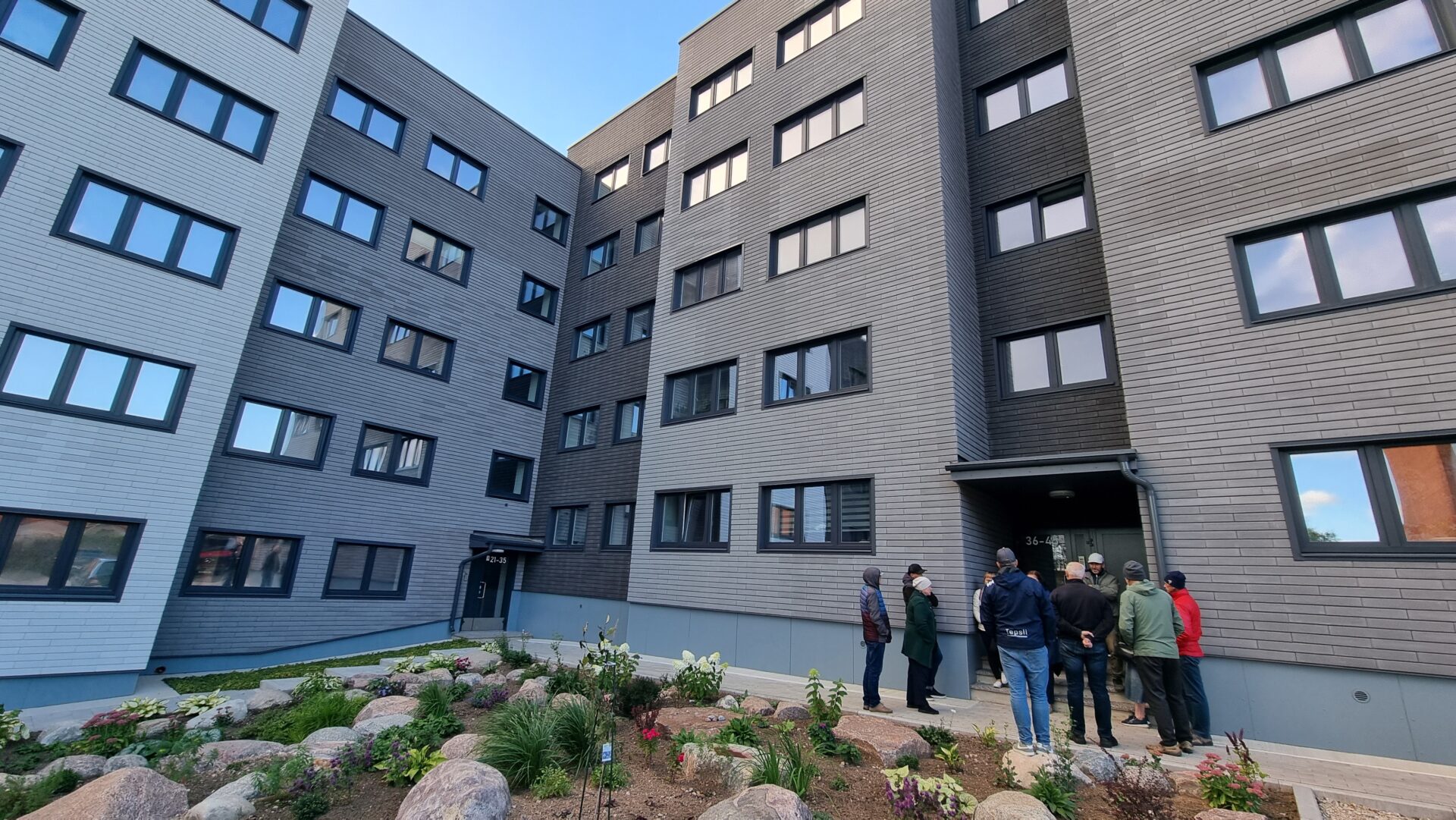 Õpperingkäigul osalejad Vilja tn 4 Marmoroc fassaadikattega korrusmaja ees